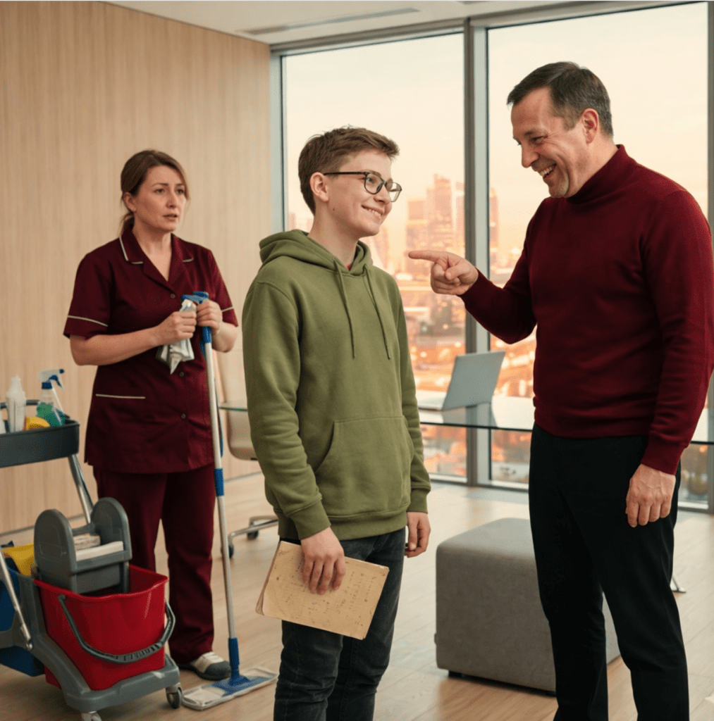 A gazdag befektető kigúnyolta a takarítónő fiát a nyelvtudása miatt. A nevetés abbamaradt, amikor a fiú talált egy rejtett pontot a szerződésben.
