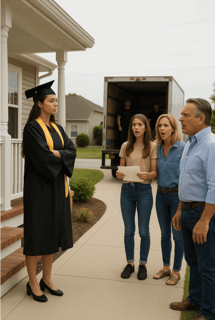 Két nappal később visszatértek egy költöztető teherautóval. Ashley magabiztosan, telefon a kezében, megdermedt, amikor meglátott a verandán, karba tett kézzel. Mellette állt Mark Harris úr, a megyei ingatlannyilvántartás tisztviselője.