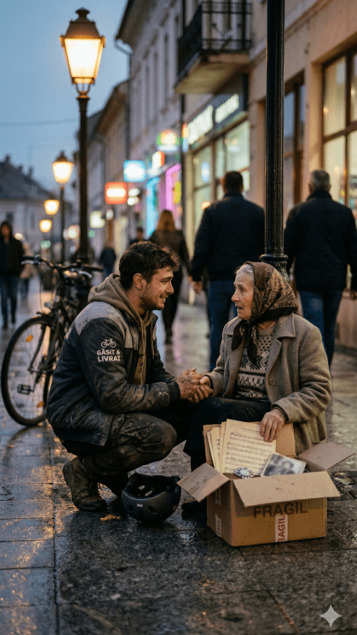 Aztán egy esős estén minden megváltozott.A kották már átáztak, a hideg beszivárgott a csontjaiba, amikor egy fiatal futár hirtelen megállt előtte. Sáros volt, kimerült, sietett volna tovább – mégis maradt.