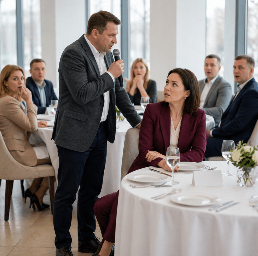 Aztán felállt.– Huszonöt év együtt – kezdte ünnepélyesen. – De eljön az idő, amikor az ember tovább akar lépni.A terem elcsendesedett– Találkoztam valakivel – mutatott egy fiatal nő felé a sarokban. – Ő új életet ad nekem.