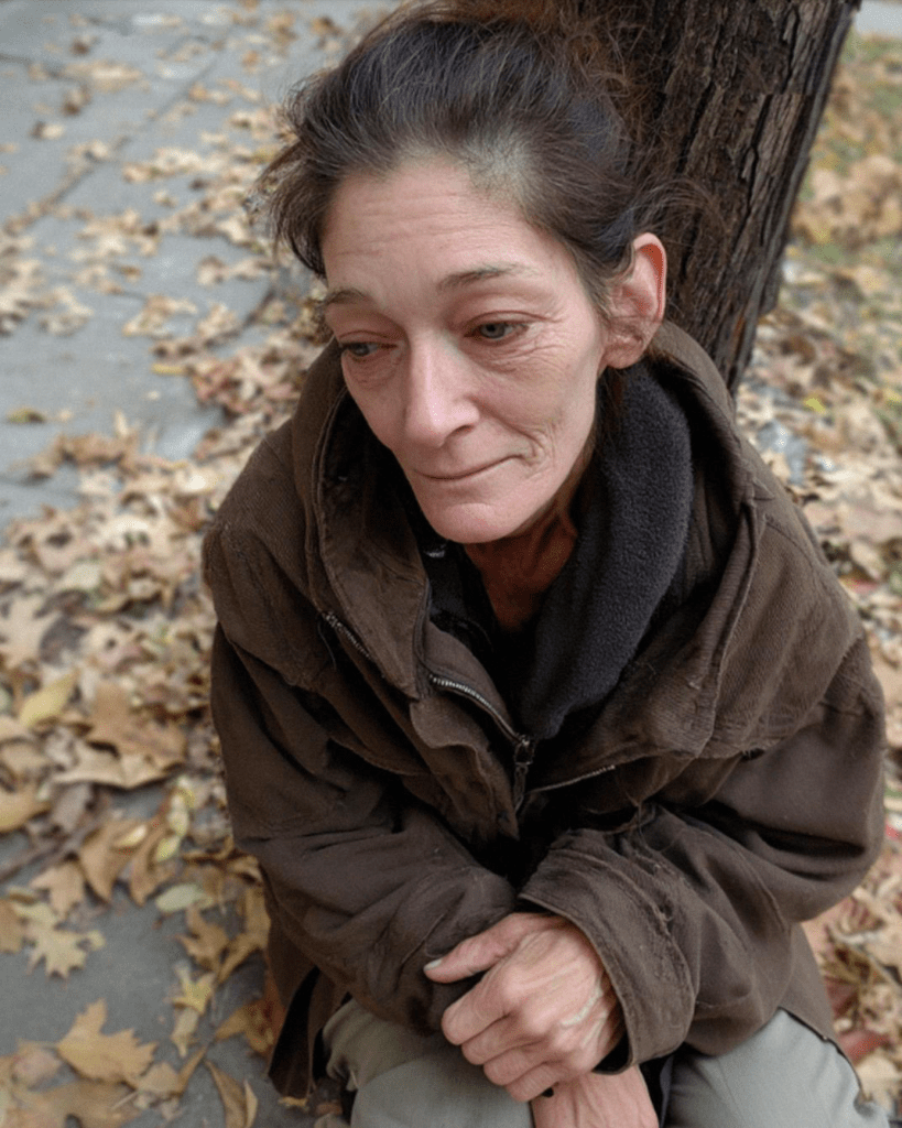 de azt mondtam magamnak, hogy „egy normális vacsorához” van. Valójában valószínűleg csak egy szelet pitét ettem volna, a többit érintetlenül hagytam volna.Aztán megláttam őt. Egyedül, egy kopár juharfánál. Kabát nélkül. Reszkető kezek a térdén. Szemei a földre szegeződtek, mintha a beton elnyelné őt.