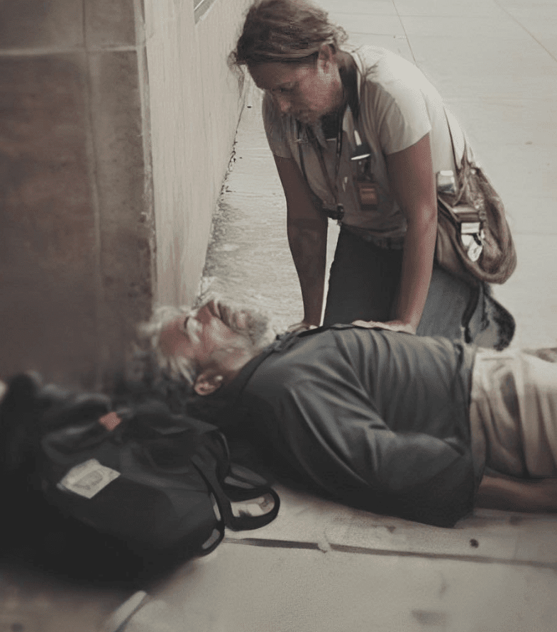 „Kezdjen újraélesztést” — mondta a diszpécser.És ő elkezdte.Nyomás. Számolás. Lélegzetvételnyi félelem. Újabb nyomás. A város eltűnt körülötte, csak a férfi maradt és a saját reszkető keze.